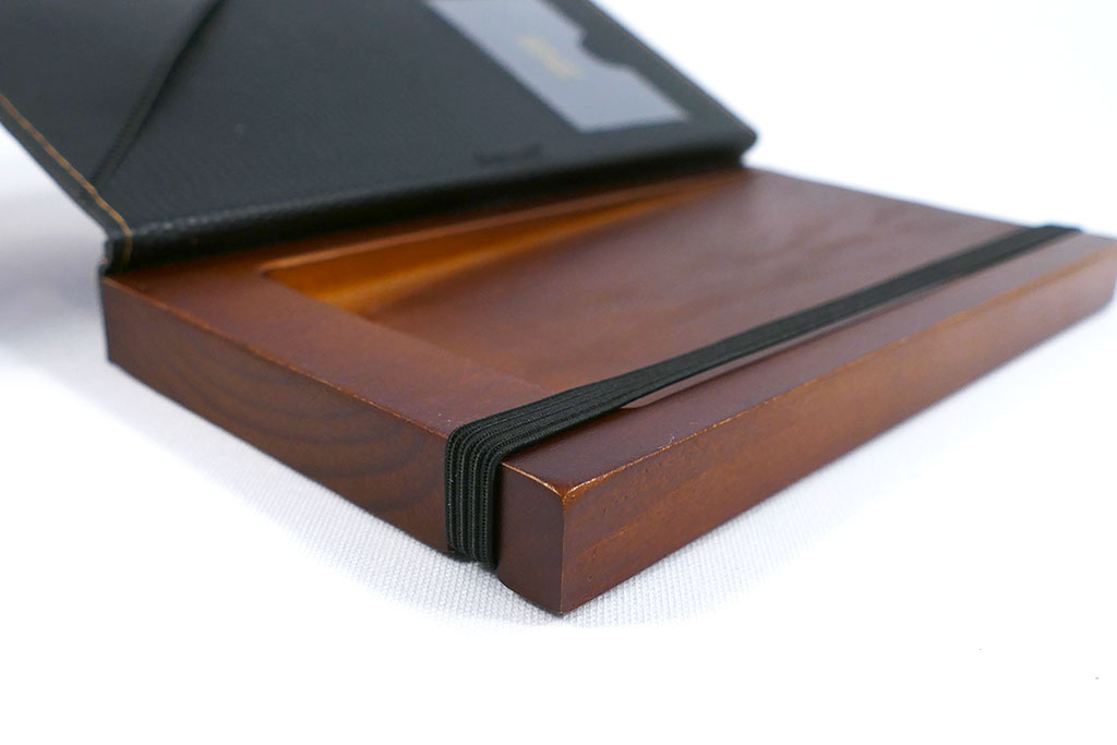 Een elegante oplossing waarin zowel munt- / briefgeld en creditcards in passen. De schuin aflopende houten case wordt afgesloten door een leren omslag en gefixeerd met een elastieken band. Tevens heeft de binnenkant van de leren omslag ruimte voor een creditcard of bon.