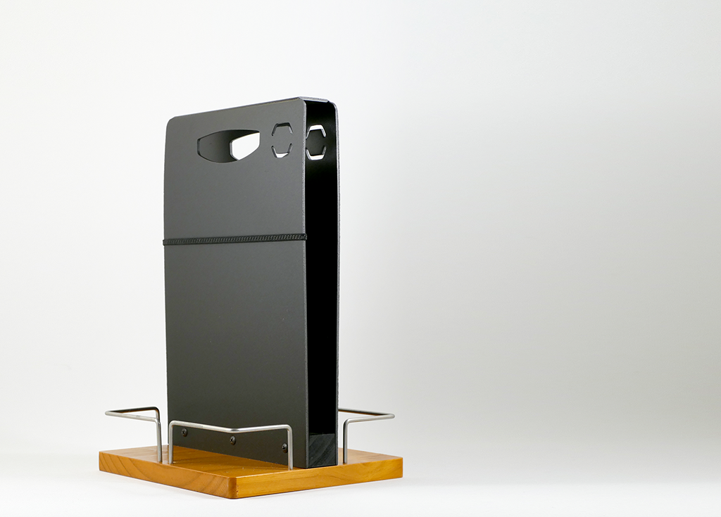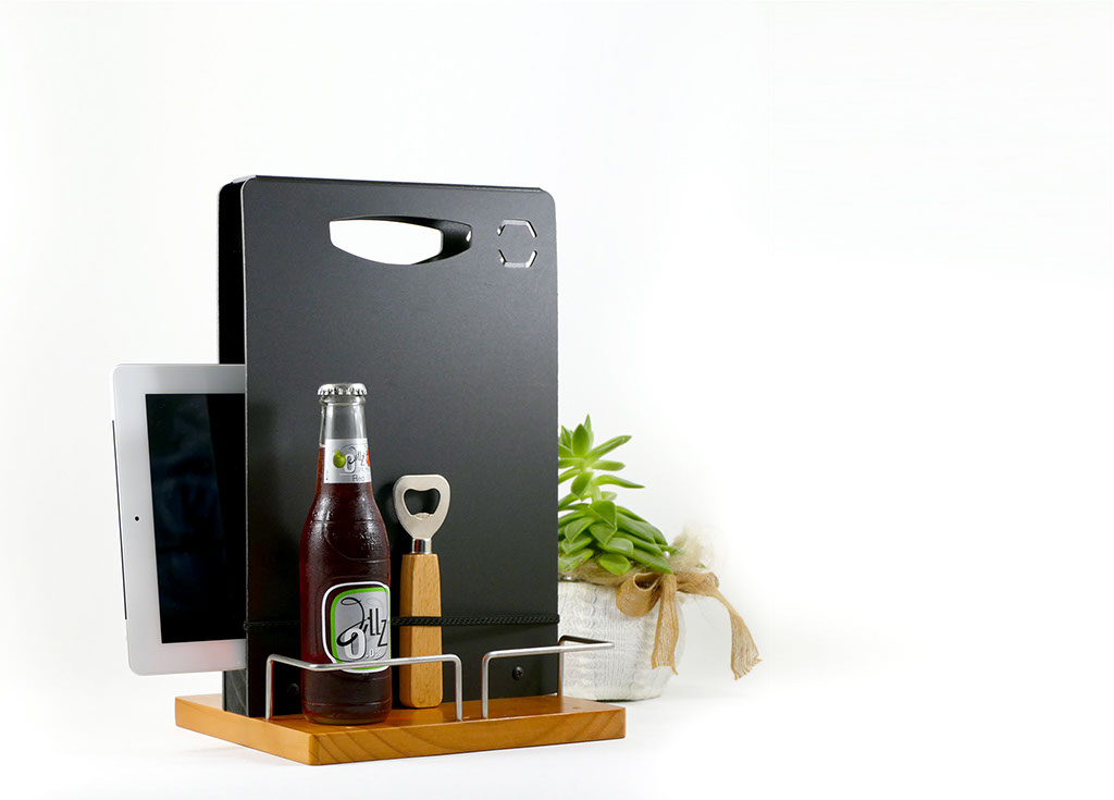 Deze table caddy is ontworpen uit noodzaak voor een moderne variant op de huidige bestaande table caddy's. Het is te gebruiken in restaurants voor peper-zout, olijfolie, sauzen, bestek, kleine glazen en/of menukaarten. Tevens is het zwarte oppervlak te beschrijven met een krijtstift zodat er een dagmenu of aanbieding kan worden aangeprezen. De toegevoegde rubberband kan ook gebruikt worden om een flyer vast te houden. Oftewel, dit product is zo beperkt als de creatieve geest van de gebruiker.